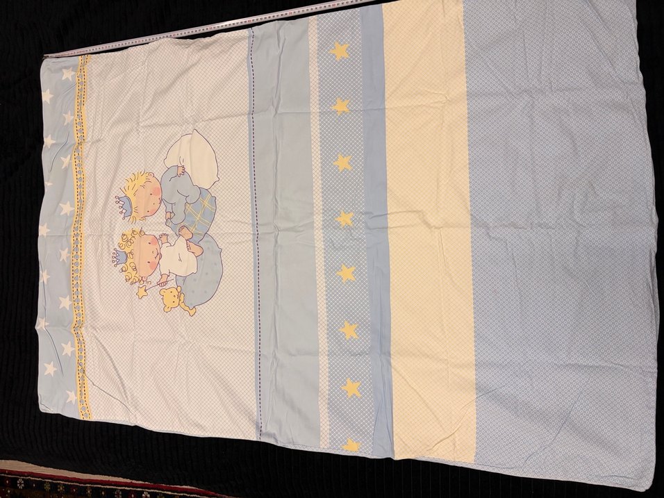 Pastel mavi renkte, yıldız desenli ve eğlenceli baskılı çocuk uyku tekstili, yumuşak sentetik kumaştan üretilmiştir.