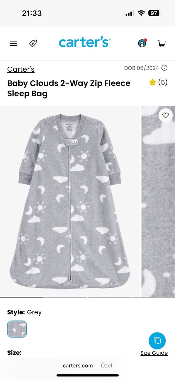 Carter's marka gri renkli, bulut ve ay desenli yumuşak dokulu, çift yönlü fermuarlı bebek uyku tulumu.