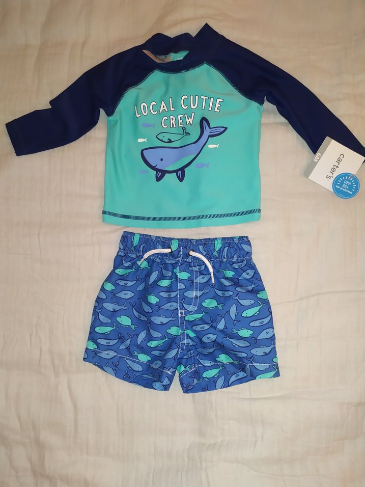 Carter's Erkek çocuk için mavi renkli uzun kollu, bisiklet yaka, baskılı üst ve balık desenli şorttan oluşan mayo takımı. Üstte düğme detayları bulunur, yumuşak ve sıcak kumaştan üretilmiştir. Uv korumalı.