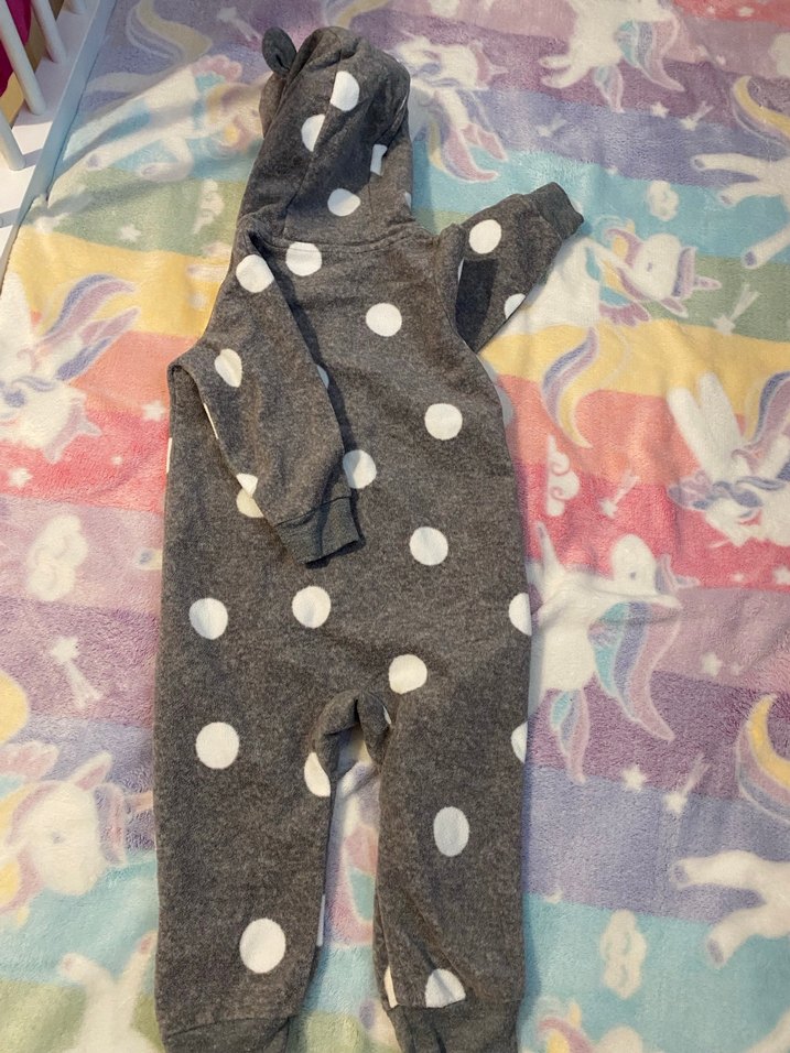 Kapüşonlu ve düğmeli gri bebek tulumu, eğlenceli puantiyeli desenlidir. Yumuşak ve sıcak kumaştan üretilmiştir. ❄️