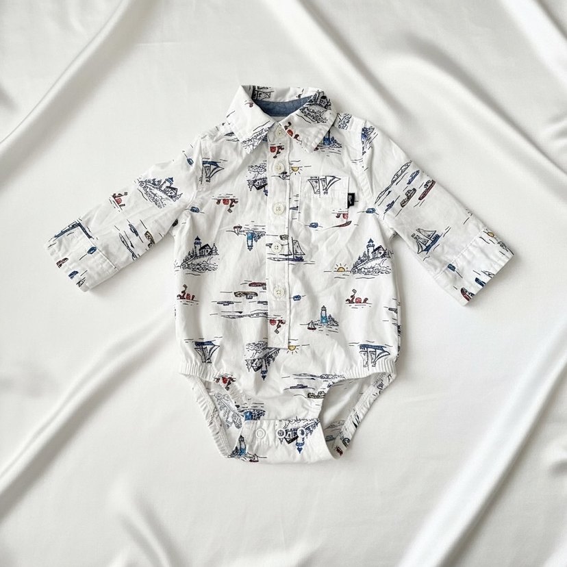 Pamuk kumaştan üretilmiş, uzun kollu, yakalı ve düğmeli gemi baskılı bebek erkek body. Aşırı tatlı gösteriyor. Sanırım biraz büyük adam gibi giydirmeyi seven annelere hitap ediyor. Bir kere fotoğraf çektirmek için giydirdim. Yeni sezon normalde fiyatı 2.500 tl pantolonu da dolabımda mevcut. (Bebek deterjanı ile yıkıyorum.)