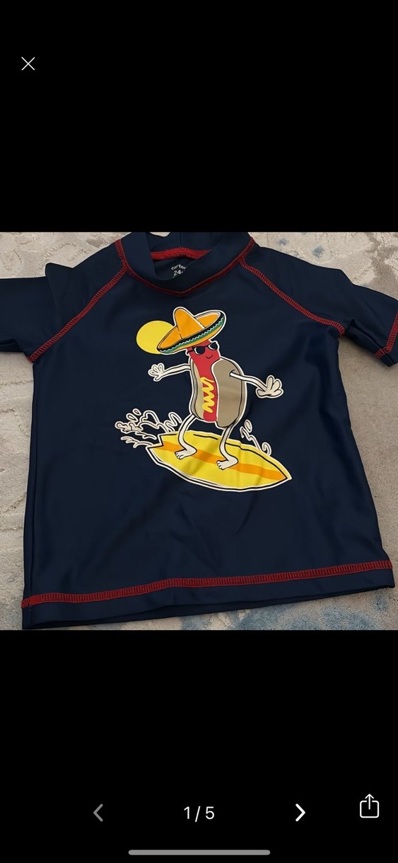 Koyu mavi, kırmızı dikiş detaylı kısa kollu mayo üstü. Üzerinde sombrero takan sörf yapan sıcak köpek baskısı bulunur. ♂️