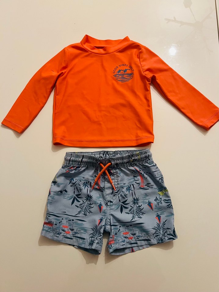 Erkek çocuk için turuncu uzun kollu mayo üstü ve tropik desenli, ayarlanabilir bağcıklı gri şorttan oluşan set.Orjinal Carters üründür.
