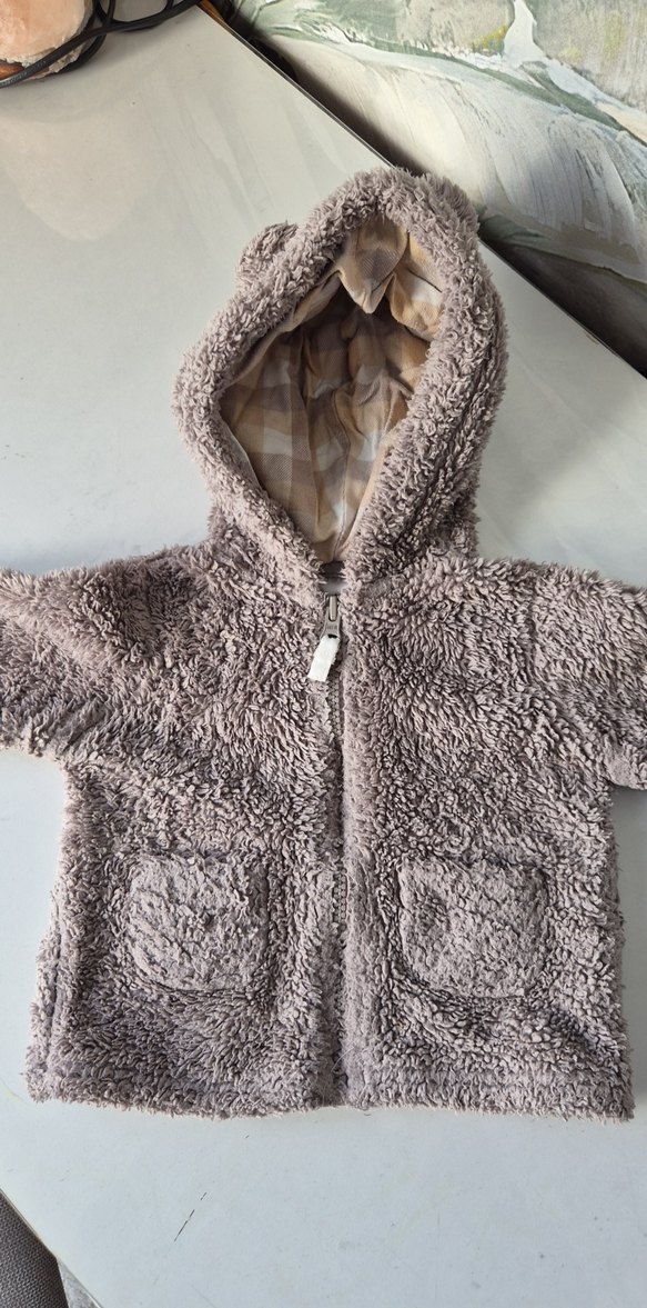 Kapüşonlu, kahverengi, yumuşak ve sıcak peluş kumaştan yapılmış çocuk montu.Ön iki cebi mevcut