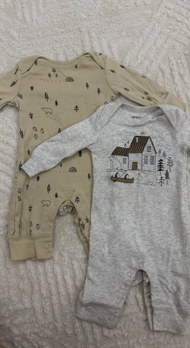 Uzun kollu, bol kesim erkek bebek tulumları, örme kumaştan. Biri gri, ev ve ayı desenli, diğeri bej, doğa motifli. 3 ay. Yaz bebeği olduğu için bir kaç kez kullanıldı.