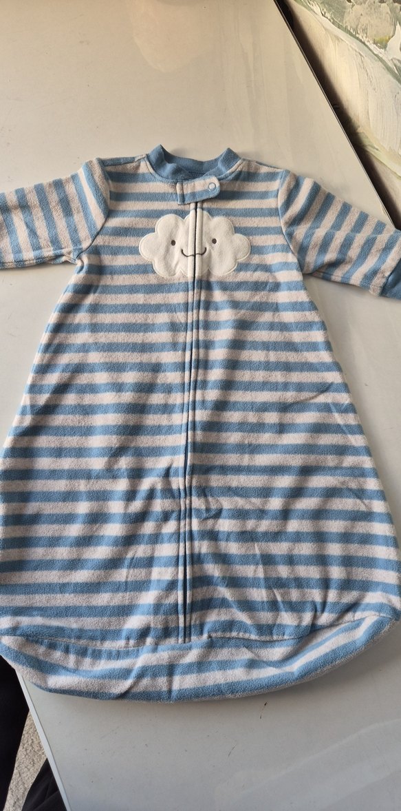 Uzun kollu, yakalı ve fermuarlı, mavi ve gri çizgili çocuk uyku tulumu. Önünde gülen bulut detayı bulunur. ☁️ s beden diye geçiyor.Dogumdan 6 aya kadar giydirilebilir bence.