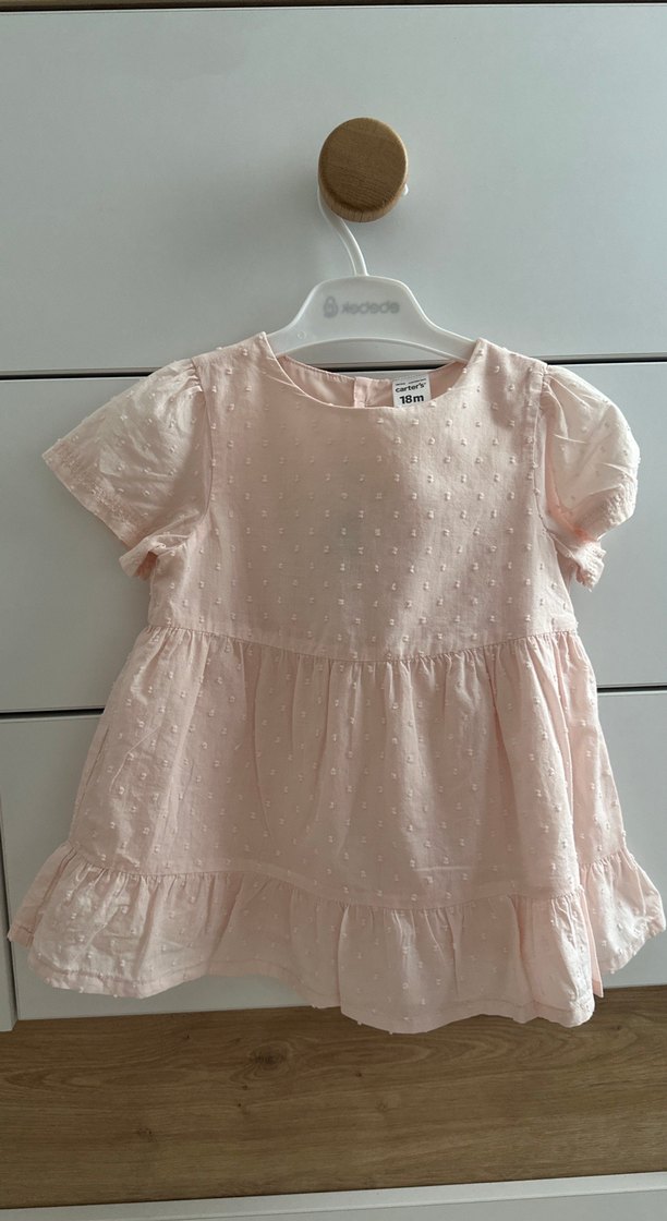 Pastel pembe renkli kız çocuk elbisesi, kısa kollu ve bisiklet yaka. Nakışlı, pamuk ve şık kumaştan, bol kesim, arkadan düğmeli ve volan detaylıdır. Üstte fotoğraflardakinden çok daha güzel durmaktadır. Çok az kullanılmıştır, tertemizdir.