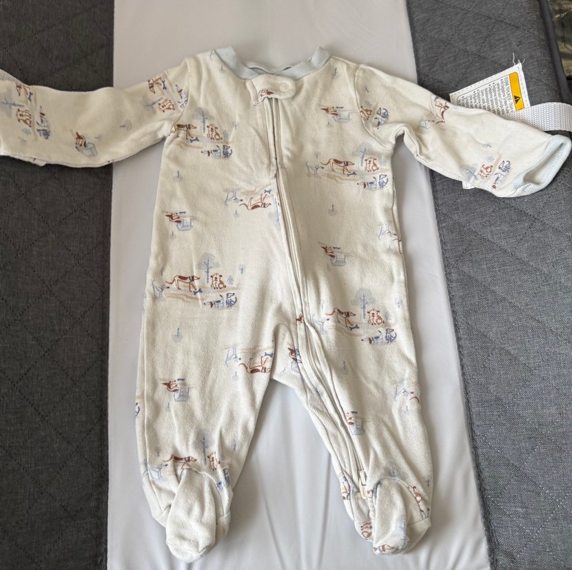 Yumuşak ve sıcak kumaştan, uzun kollu ve yüksek yakalı bebek tulumu. Çift taraflı fermuar kapamalı, beyaz ve gri üzerine hafif hayvan desenlidir.