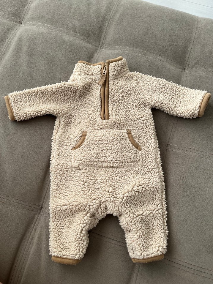 Yumuşak kürk dokulu kahverengi bebek tulumu, yarım fermuarlı ve ön cep detaylı, sıcak ve rahat tutar. ❄️ tüylenme var