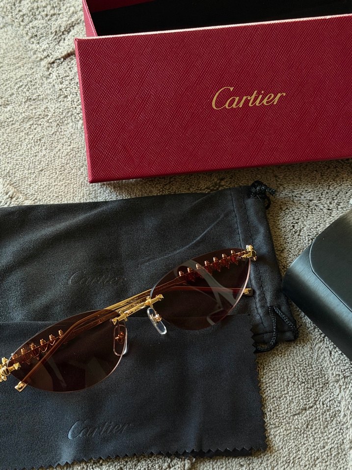 Altın renkli, boncuk detaylı ve parlak yüzeyli Cartier kadın gözlüğü. Klasik ve karşı kültür tarzını yansıtır. Marka kutusu ve kılıfı ile birlikte.