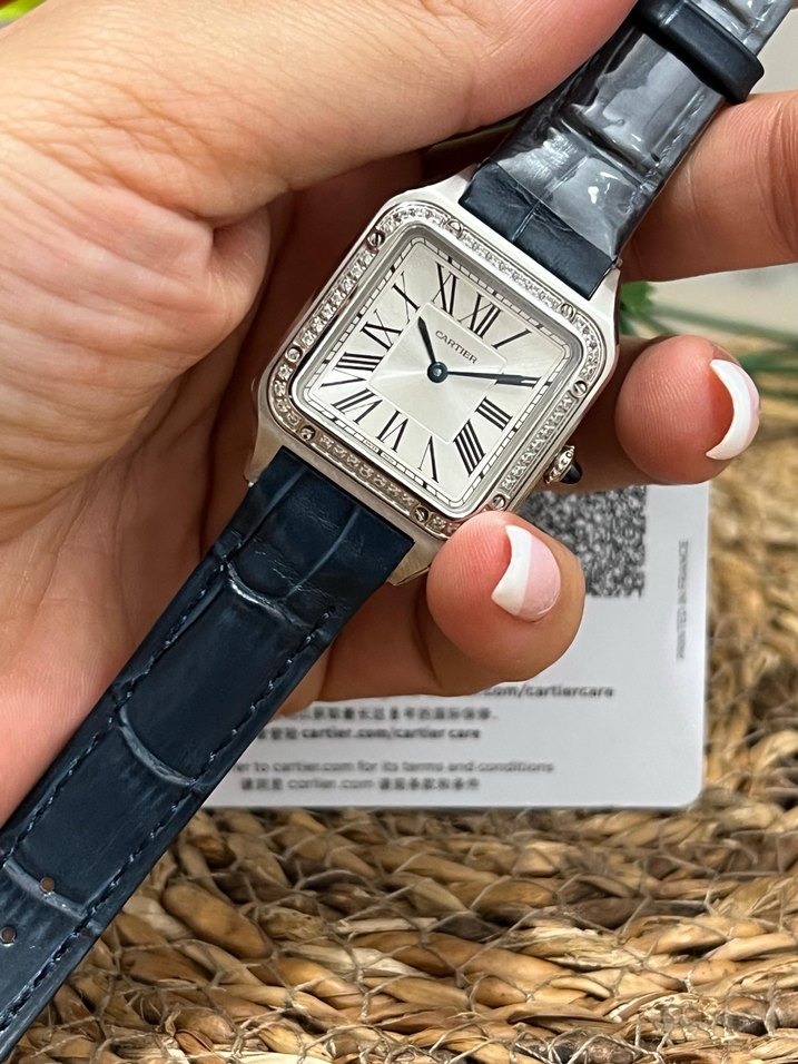 Cartier Santos modelidir. Pilli (Quartz) mekanizma. Kare kasa, ikonik Santos tasarımı. Roma rakamlı kadran. Mavi taşlı kurma kolu. Klasik ve şık duruş. Fiyat ve detay için mesaj atabilirsiniz.