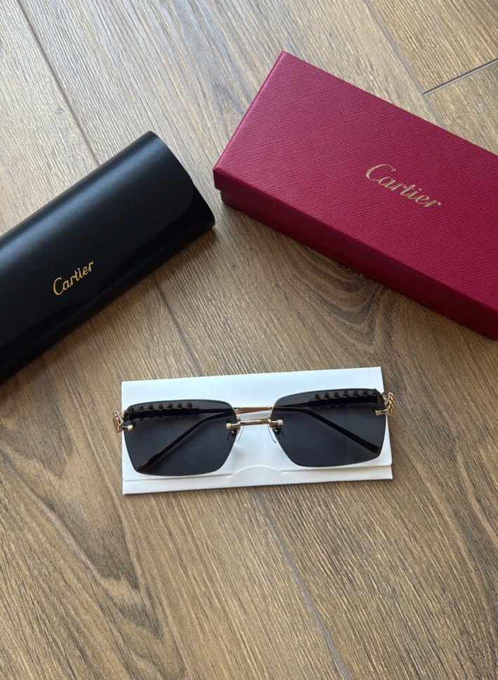 Cartier kadın güneş gözlüğü, koyu siyah camlar ve boncuk detaylı çerçeveye sahip. Modern klasik tasarımla şıklık sunar. Kutu ve kılıf dahil. ️