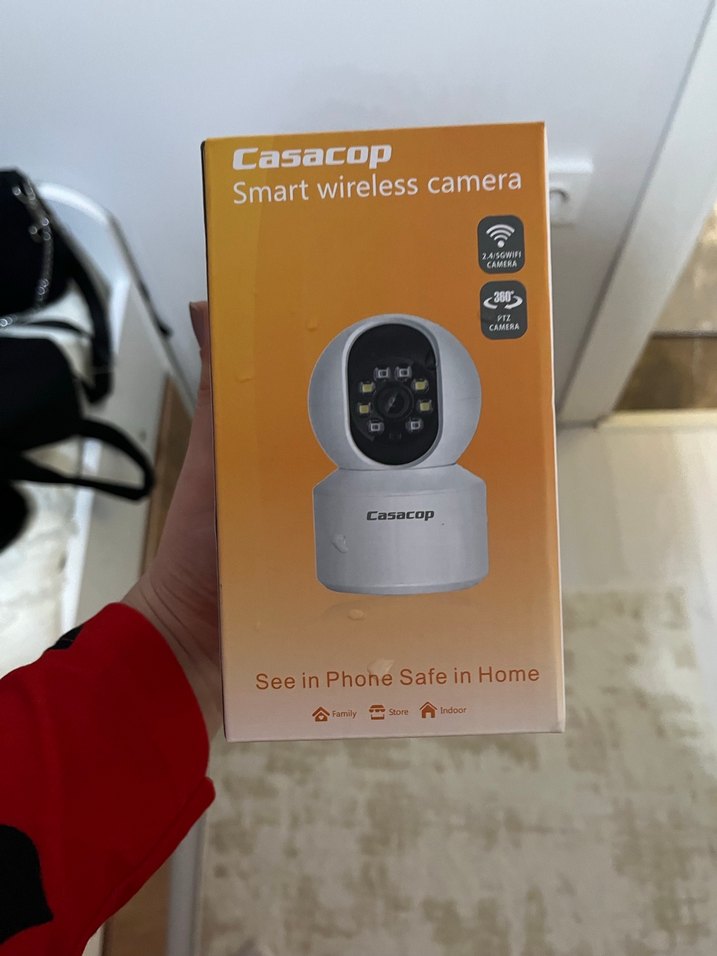 Casacop akıllı kablosuz kamera, 2.4 GHz bağlantı ve 360° dönebilen PTZ özelliği ile ev güvenliği sağlar. Telefonla izleme desteği bulunur.