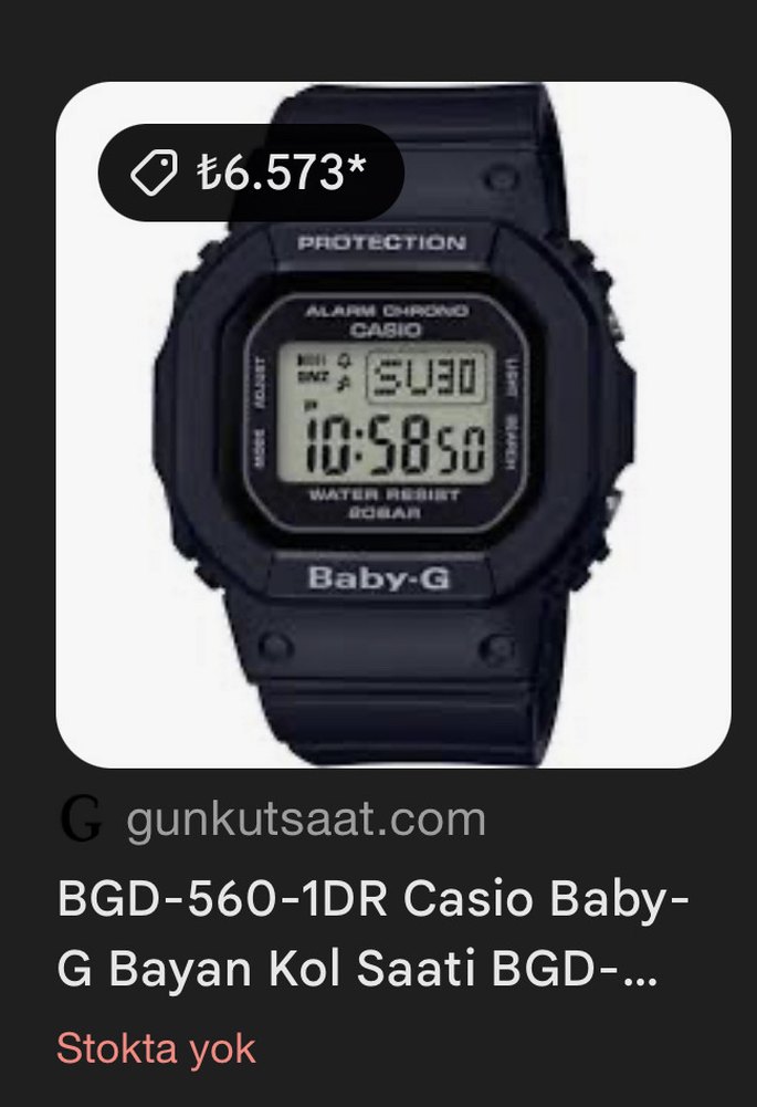 Casio'nun ikonik Baby-G serisinin BGD-560 modelidir.Hiçbir yerinde çiziği yoktur. 20 Bar (200m) su geçirmezlik (yüzmeye uygun), darbelere dayanıklı yapı, alarm, kronometre, geri sayım ve dünya saatleri mevcuttur. Tüm tuşları, ışığı ve ekranı sorunsuz çalışmaktadır.