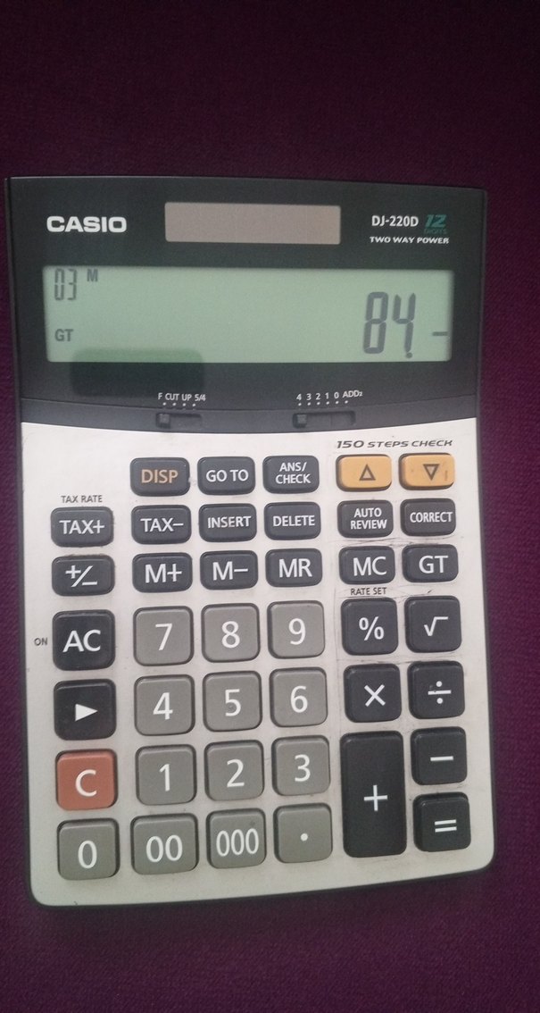 Casio DJ-220D hesap makinesi, vergi ve hafıza fonksiyonlarına sahip büyük ekrana sahiptir. İki yönlü enerji ile çalışır ve çeşitli fonksiyon tuşları bulunur.
