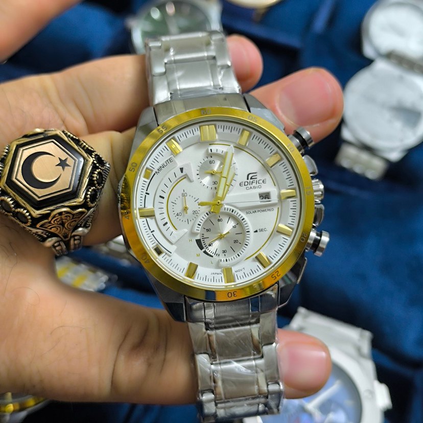 Casio Edifice erkek saati, parlak beyaz kadran ve altın detaylarla, paslanmaz çelik kayış ve kronograf özelliklerine sahiptir. ⌚