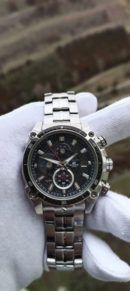 Gri kadranlı, çoklu alt kadranlara sahip erkek kol saati. Metal halka bilezik ve iş stiline uygun çağdaş tasarım içerir. ⌚