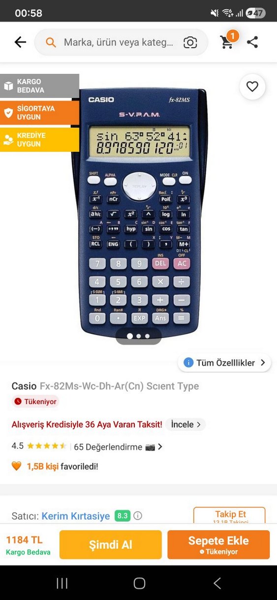 Casio Fx-82Ms, sine, cos ve log gibi fonksiyonlar içeren koyu mavi bilimsel hesap makinesidir. Net ekran ve çoklu fonksiyon tuşlarına sahiptir.