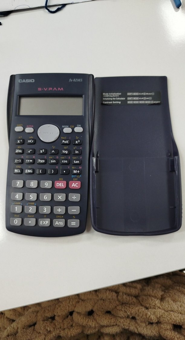 Casio fx-82MS hesap makinesi, koyu lacivert renkte, çok fonksiyonlu tuşlara sahip ve koruyucu kapaklıdır. Gelişmiş hesaplamalar için uygundur.