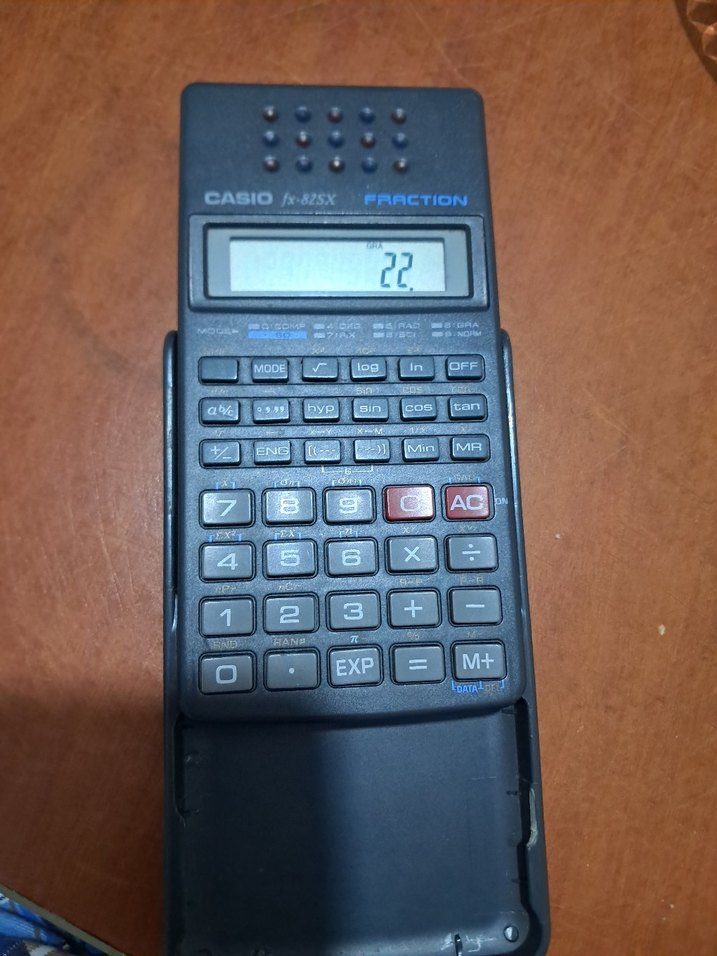 Casio fx-82SX hesap makinesi, siyah renkte ve 22 sayısını gösteren ekranla birlikte çeşitli fonksiyon tuşlarına sahiptir. Kaydırmalı koruyucu kapağı mevcuttur.