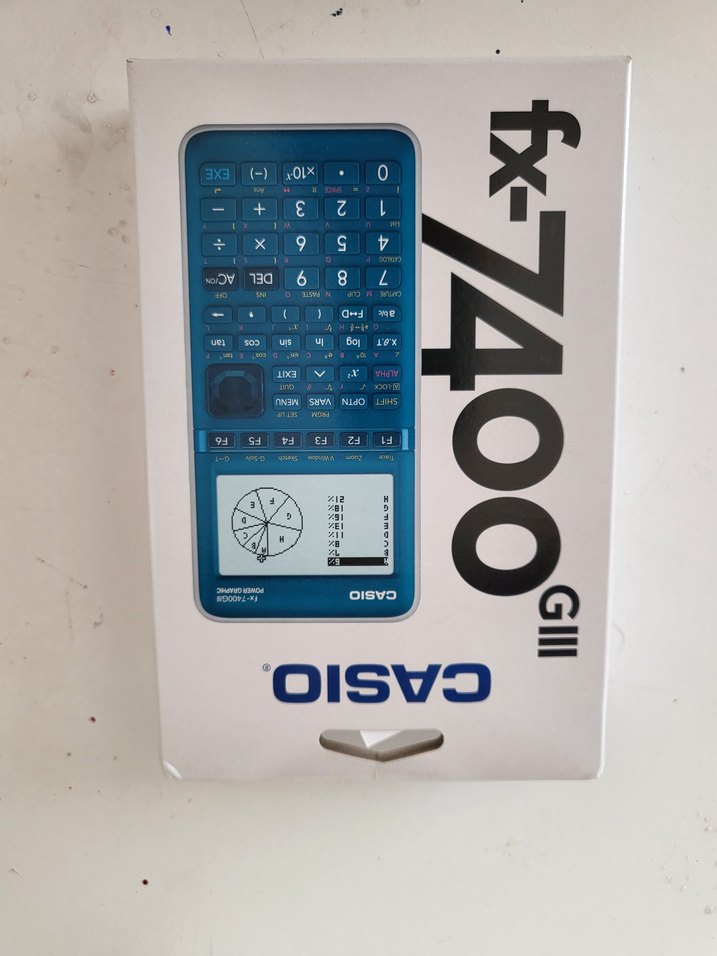 Casio fx7400 GIII hesap makinesi koyu mavi renkte, net tuş takımı ve grafik ekranına sahiptir. Gelişmiş hesaplama ve grafik çizim özellikleri sunar.