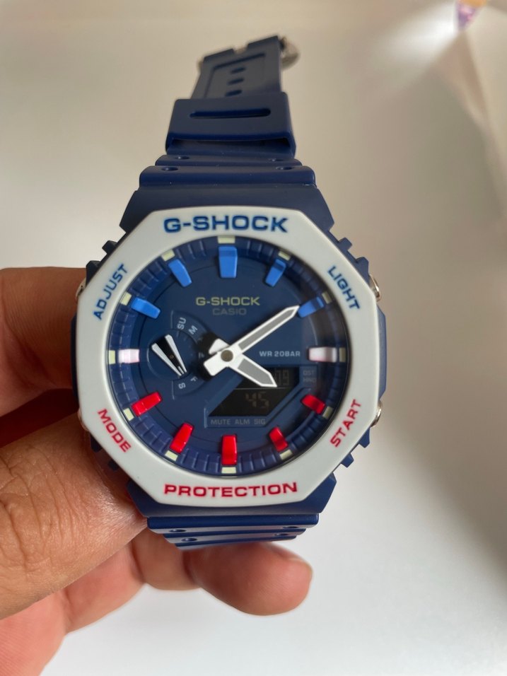Casio G-Shock erkek saati, mavi kadran ve renkli detaylara sahip. Koruma, ışık ve mod ayarları bulunur. Günlük sokak stiline uygundur. ⌚