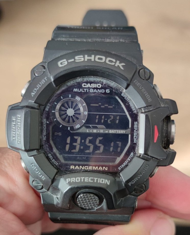 Siyah Casio G-Shock Rangeman erkek kol saati, dijital ekran, Multi-Band 6 teknolojisi ve dayanıklı tasarıma sahip. Koruma ve çoklu sensör özellikleri bulunur. ⌚