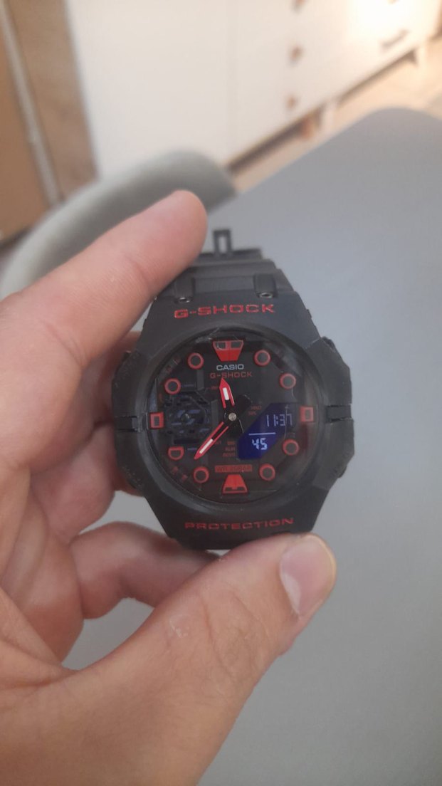 Casio G-Shock erkek kol saati, koyu renk ve kırmızı detaylarla rock punk tarzında. Analog ve dijital göstergeli, 45 rakamı ekranında görünüyor casio ga 2100 modeli saat saat sıfıra yakındır temizdir pili yeni takıldı led ışıklı kronometreli takvim pencereli hem dijital hem alıp 200 m yani 20 bar su geçirmezlik mevcuttur seri numarası mevcuttur kutusu vardır Tayland üretimidir şimdiden alacak kişiye Hayırlı olsun isteyene videosu atılır ⌚