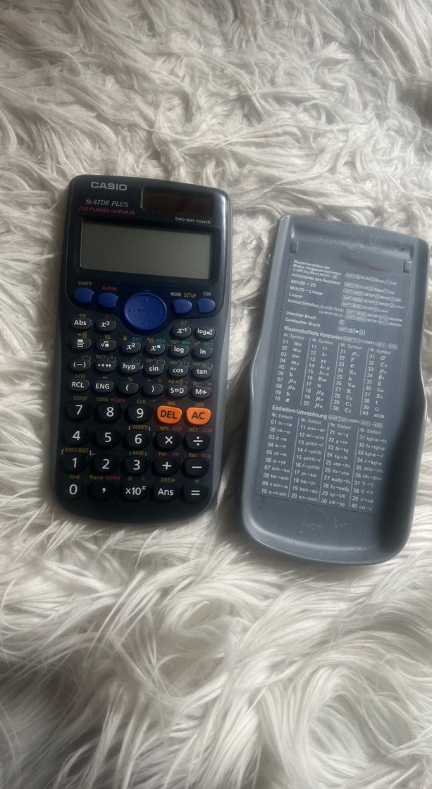 Casio fx-570DE Plus hesap makinesi, çeşitli fonksiyon tuşları ve net ekran ile donatılmıştır. Koruyucu gri kapağı üzerinde referans tabloları bulunmaktadır.