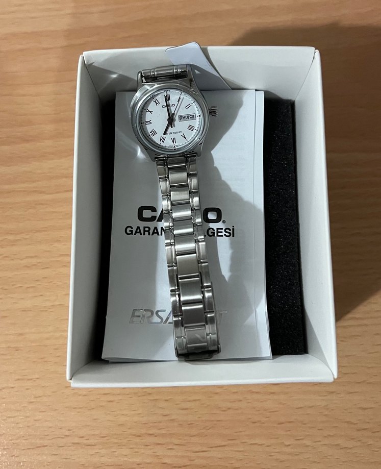 Casio kadın saati, gri metal kayış ve beyaz kadranda Roma rakamları ile gün-tarih göstergesine sahiptir. Klasik ve sokak stilini birleştirir. ⌚