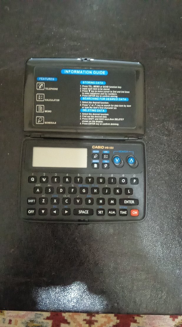 Casio MB-550, küçük siyah elektronik klavye, QWERTY düzeninde ve küçük ekrana sahip. Telefon, hesap makinesi, not ve programlama özellikleri bulunur.( Pazarlık payı var)