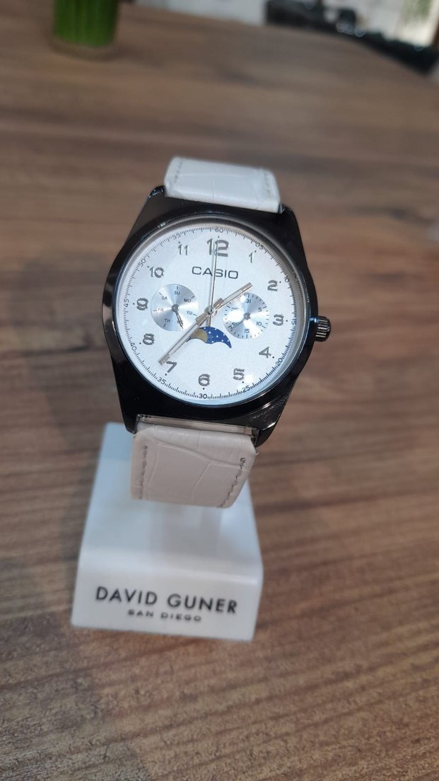 Beyaz deri kayışlı, çoklu alt kadranlı yuvarlak kadrana sahip Casio marka erkek saati. İş ve sokak stili arasında şık bir tasarım sunar. ⌚ saat umreden hediye olarak geldi aşağı yukarı 1 yıldır bende iki üç defadır kullandım saati dakik diğer göstergeler sabittir çalışmıyordur dekor amaçlı 43 milim kasa çapı var kordonu beyaz kayışı deri çizik arıza kusur yoktur ince işçiliği çok güzel fiyat uygun verecektir isteyene video atabilirim