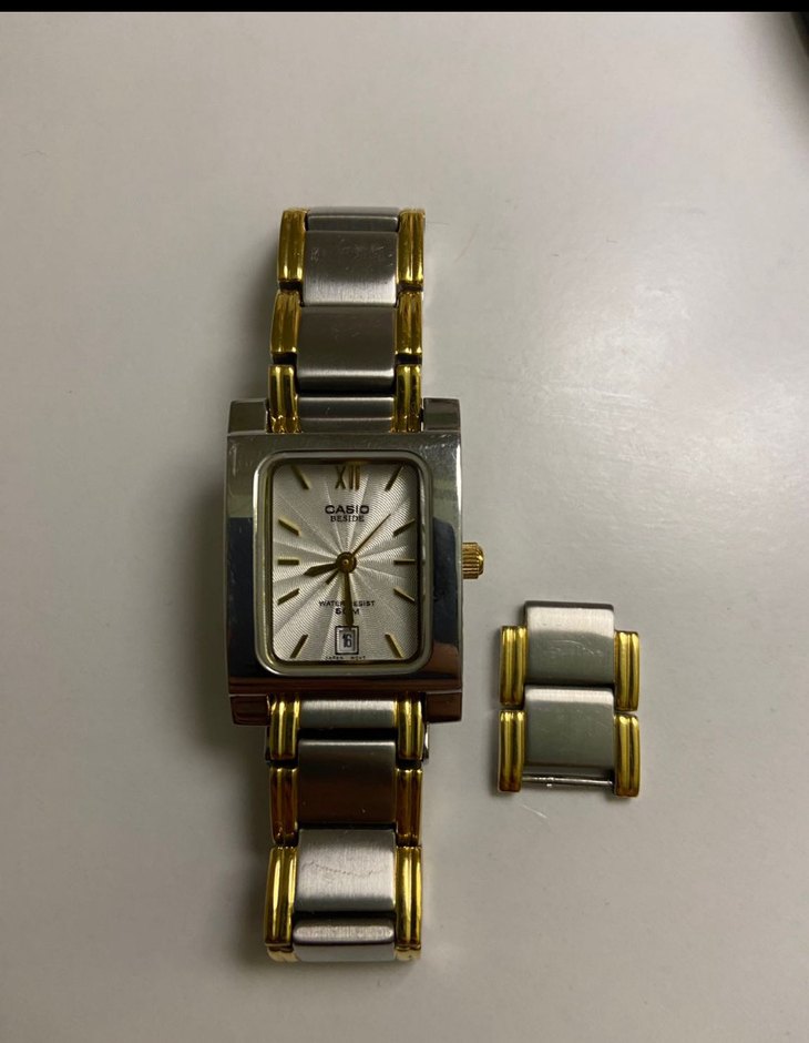 Altın ve gri metal kayışlı, tokalı kadın saati. Dikdörtgen kadran, klasik ve çağdaş tasarım, tarih göstergeli. ⌚