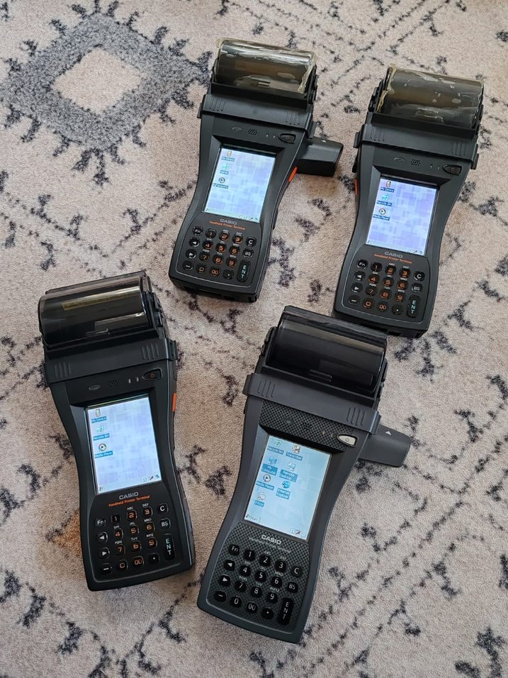 Dört adet ekran ve tuş takımı bulunan siyah Casio endüstriyel el terminalleri. Kompakt tasarım ve kolay kullanım sunar. ️İkinci el ürünlerdir, Windows işletim sistemine sahip. Adet fiyatıdır.