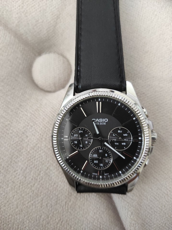 Casio erkek kol saati, siyah kadran ve üç alt kadran ile gümüş çerçeveye sahip. Siyah deri kayışlı, 50 metre su geçirmezlikli klasik biker tarzı. ⌚