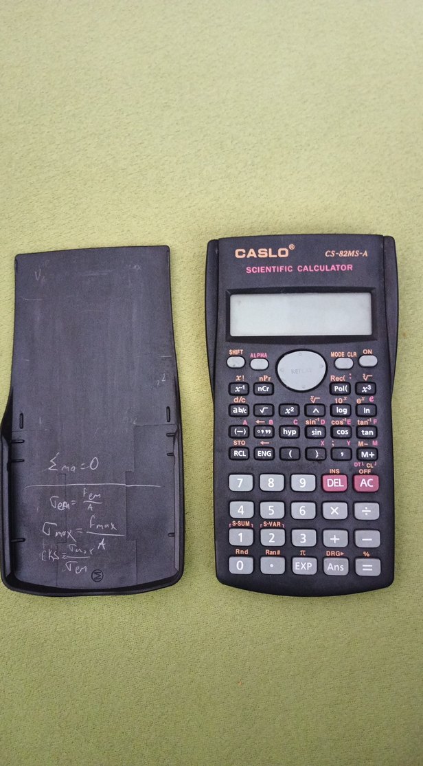 Caslo CS-82MS-A siyah bilimsel hesap makinesi, net ekran ve karmaşık hesaplamalar için çeşitli fonksiyon tuşlarına sahiptir. Koruyucu kapağı içinde formüller bulunur.