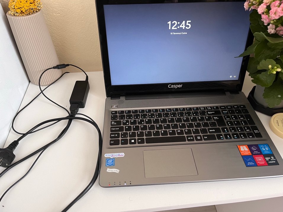 Casper markalı gri renkte dizüstü bilgisayar, tam klavye ve dokunmatik yüzeye sahiptir. Güç adaptörü ve yan USB portları mevcuttur.