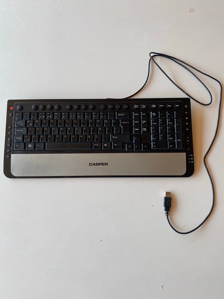 CASPER markalı, USB kablolu, koyu gri renkte tam tuş takımlı klavye, multimedya tuşlarıyla donatılmıştır. ⌨️