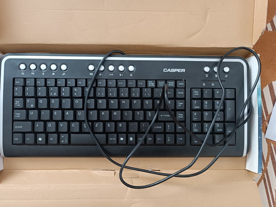 CASPER marka siyah renkli, kablolu klavye. Sayısal tuş takımı ve multimedya tuşları bulunur. ⌨️