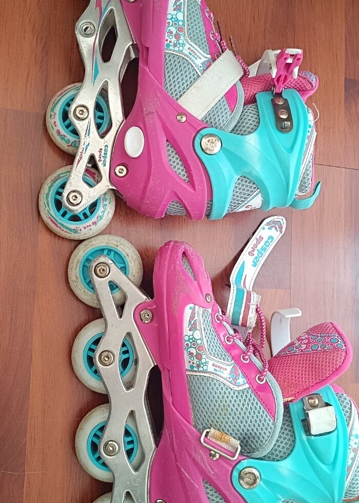 Casper Sport marka paten, renk olarak kız çocuk için daha uyumlu. Kullanıma bağlı çizilmeler var, sol ayak için olanın tekerlerinden biri yok, bisiklet tamircileri yapıyor artık kullanmadıkları için tamir ettirmemiştim, fotoda gösterdim. Etikette 35-38 uyumlu yazıyor, fotoda var zaten, benim ikizlerin biri 36-37 giyerken kullandı, diğeri 37-38 giydiği zaman kullandı. Aynısından iki tane var. Kırık bozuk vs yok, güvenli çok sağlamdır, alana hayırlı olsun