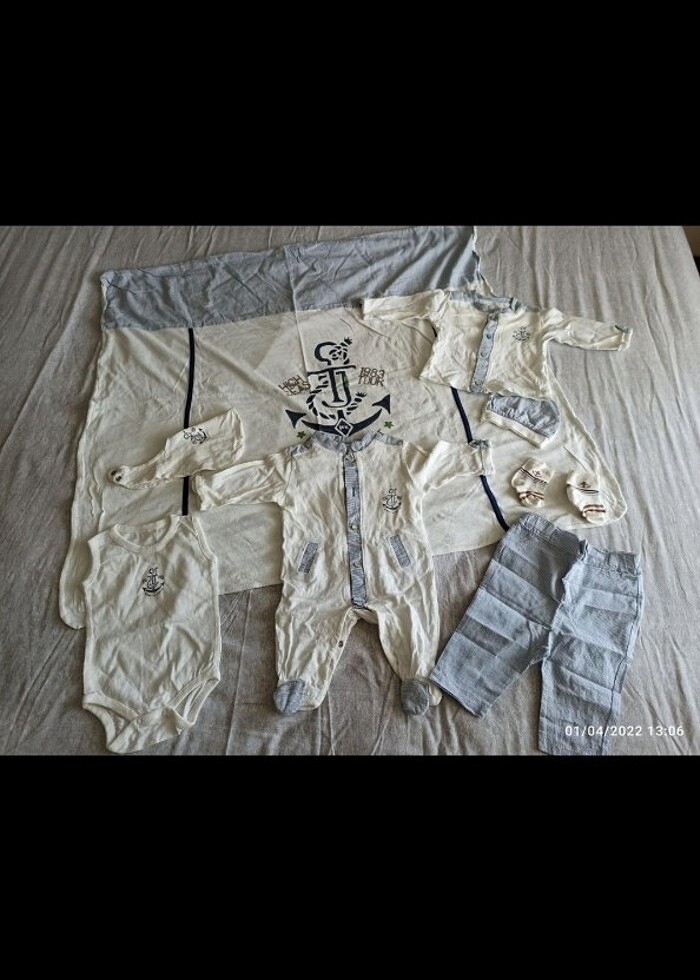 cassiope hastane çıkışı yazlık ince 56 ölçüsü yaz erkek bebeğine uyumlu kolsuz badi,çorap,önlük ,çıtçıtlı tulum ince pantalon,üst çıtçıtlı badi , şapka ,penye battaniye. sadece fotoğraf çekimi için giydirip çıkardım başka kullanılmadı,yıkayıp kaldırmıştım. kırışık haliyle yeni yıkanmadığı için ütülemedim görüntü için üzgünüm