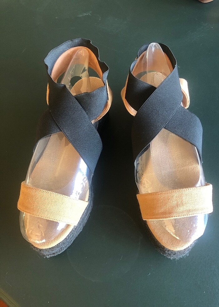 İspanyol Castaner marka Espadril, Krem rengi bant + siyah elastik bant Topuk 6,5cm Taban boyu 24,5cm Ayakta çok güzel duran rahat ayakkabı