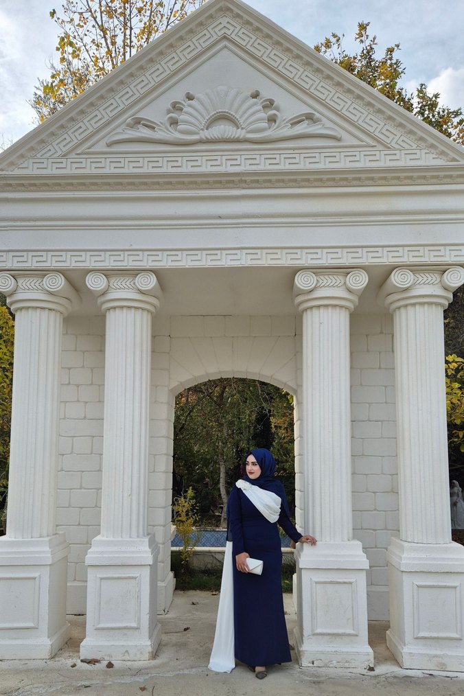Uzun kollu, yüksek yakalı mavi abiye elbise, omuzdan drapeli beyaz detayla minimalist ve şık bir görünüm sunar.bi kere giyildi hiçbi deformesi yok 74 kiloda giydim ürün boyu 150 cm