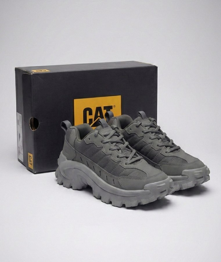 CAT markalı gri kamuflaj desenli erkek outdoor ayakkabılar, dayanıklı kauçuk taban ve sportif şıklığı bir araya getirir. Trendy casual stile uygundur.