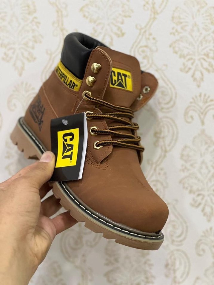 CAT markalı kahverengi kauçuk erkek botlar, bağcıklı ve günlük sokak stili için uygun, renkli ama desensiz tasarıma sahip. 43-44 Numarası Mevcut- Kutulu Gönderim