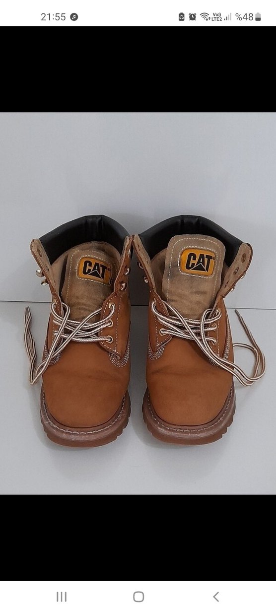 CAT markalı kahverengi deri kadın botları, günlük sokak stiline uygun. CAT logosu ön planda. defosuz çok az kullnildi ORJINALDIR