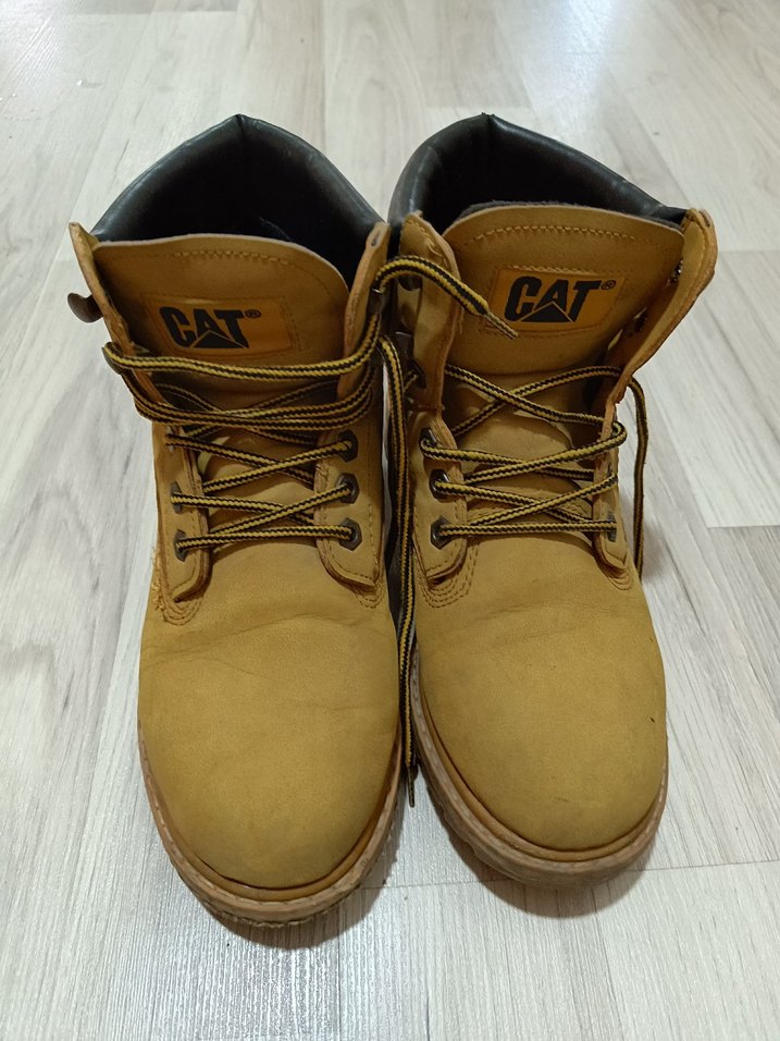 CAT kahverengi süet kadın botları, kama topuklu ve tokalı detaylara sahip, günlük sokak stili için uygundur. Desensiz sade tasarıma sahiptir. 39 numaradır. İç etiketi silinmiştir ve iç kısımda topuk yerinde deforme vardır. Orijinaldir.