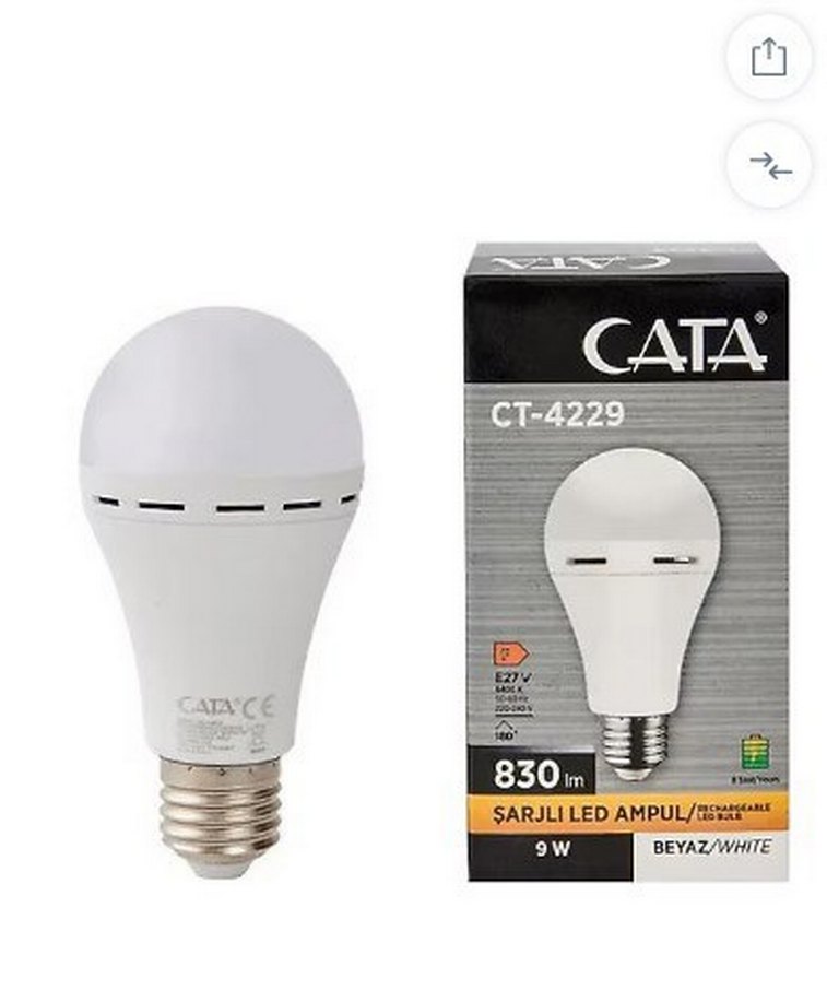 CATA CT-4229 modeli, 9W gücünde beyaz renkli şarjlı LED ampul. 830 lümen