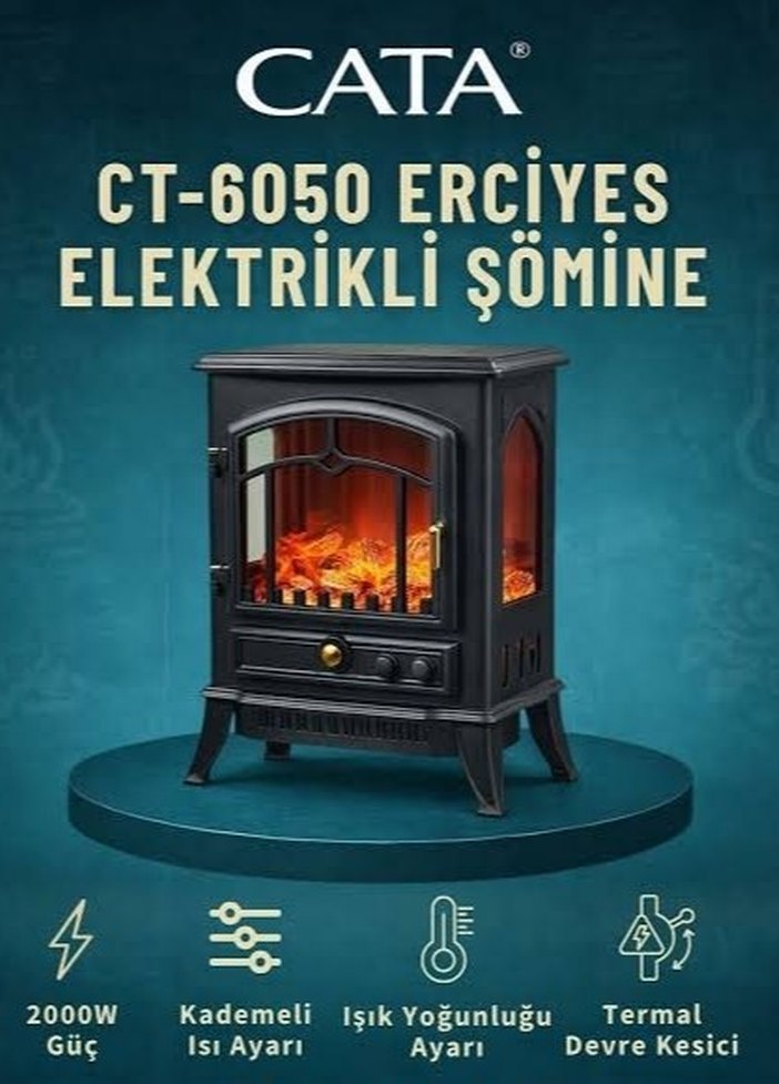 CATA CT-6050 Erciyes elektrikli şömine 2000W güç, kademeli ısı ve ışık yoğunluğu ayarı ile termal devre kesiciye sahiptir.