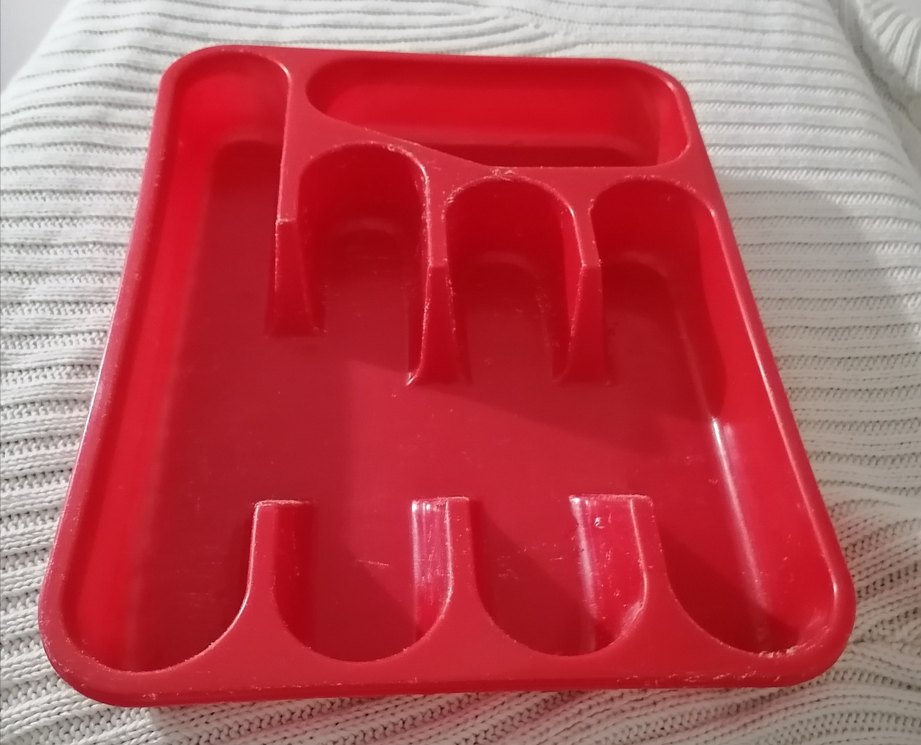 33 cm boy, 26 cm en ölçülerine sahip, koyu kırmızı, çok bölmeli, plastik, çatal, bıçak, kaşık düzenleyici..(belli bölgelerde çok yoğun soyulma ve aşınmalar mevcut, yine de işime yarar diye düşünenler yazabilir).